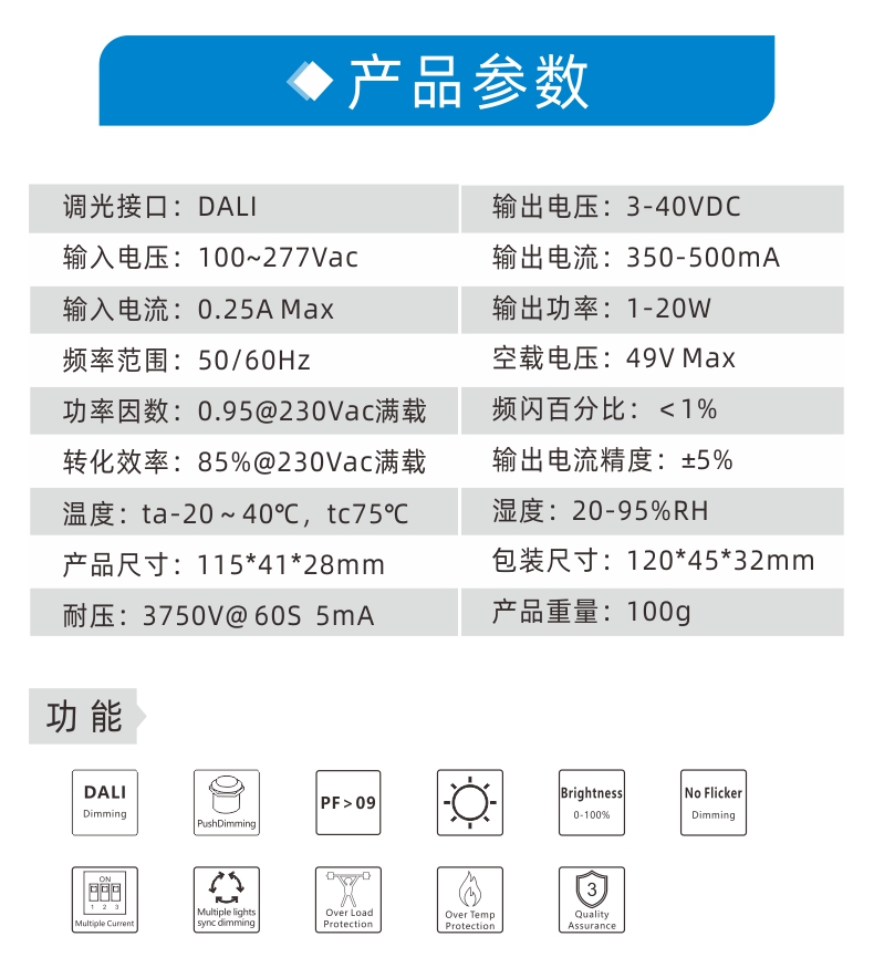 • 20W 350-500mA 3-40V 100-277V DALI恒流无频闪调光驱动0.1-100%