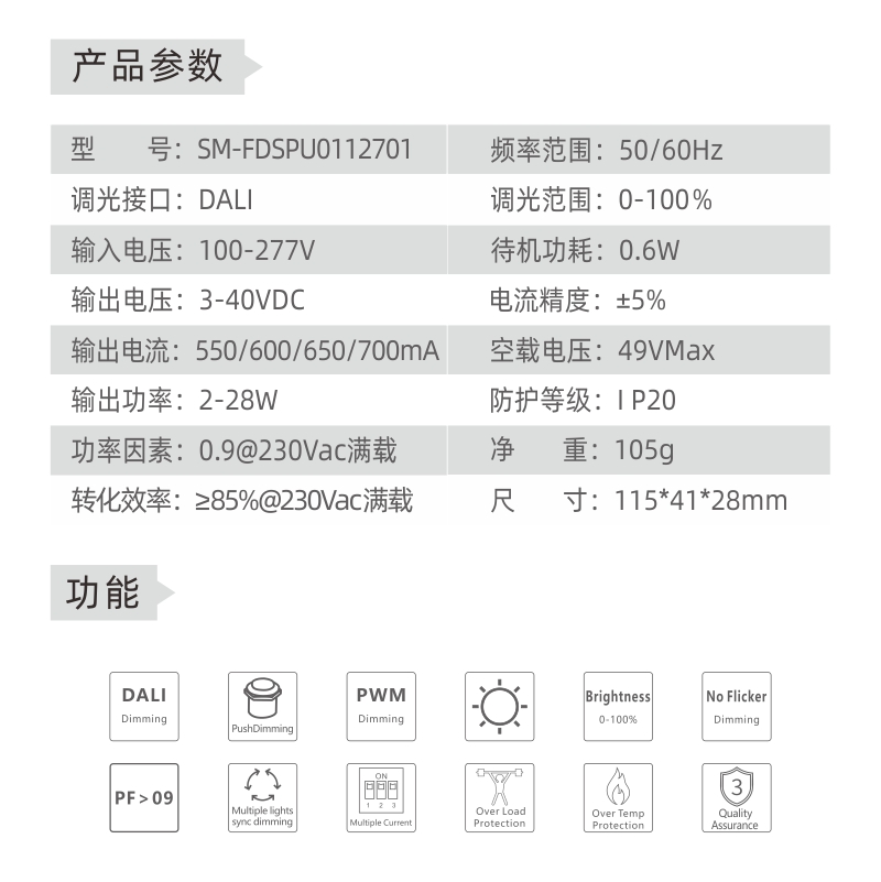 • 28W  550-700mA  3-40V 100-277V  DALI恒流无频闪调光驱动0.1-100%