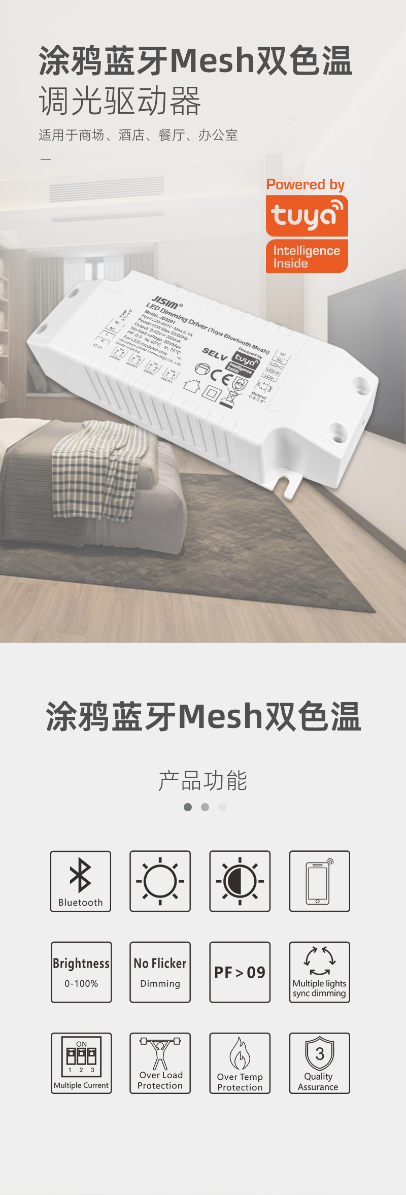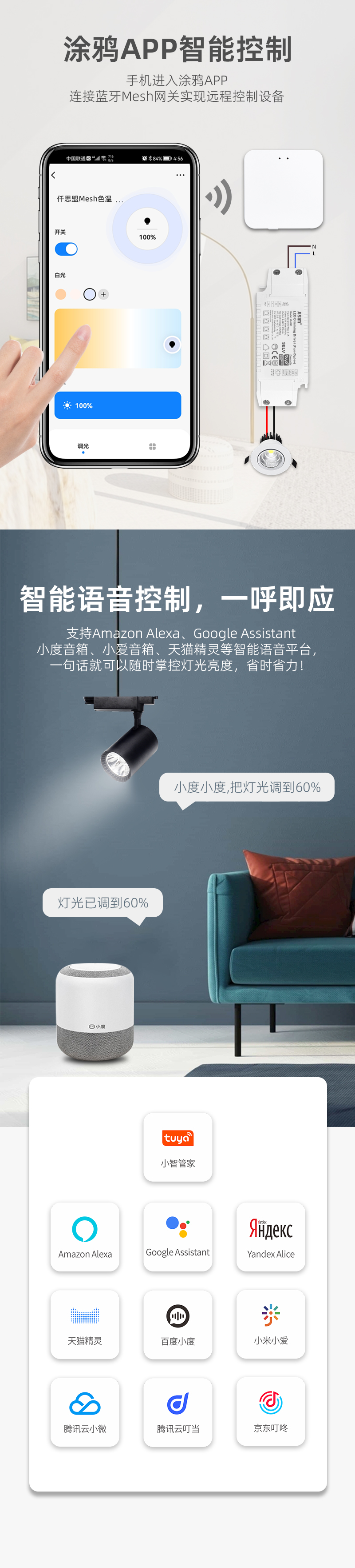 • 涂鸦蓝牙mesh智能调光驱动 语音控制 手机直连 高PF认证调光电源