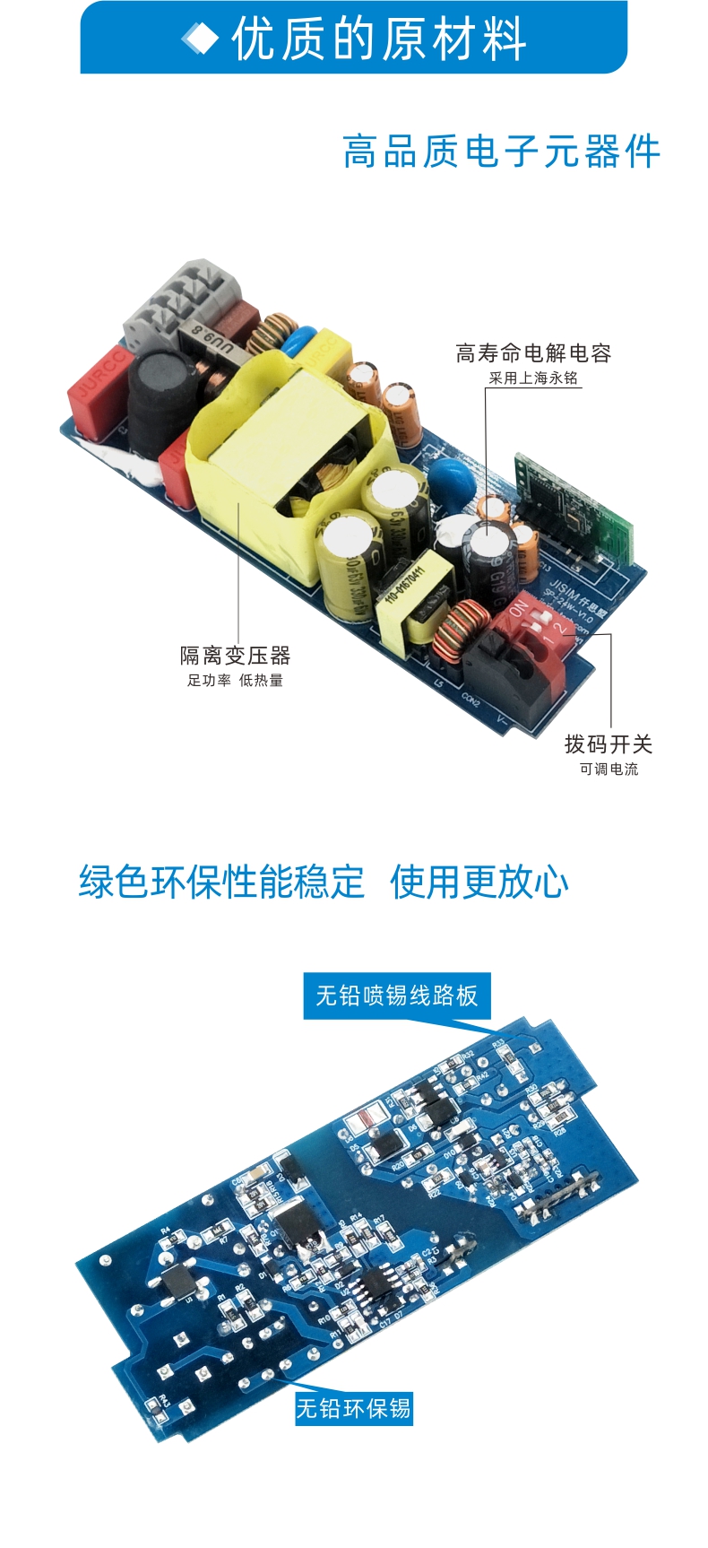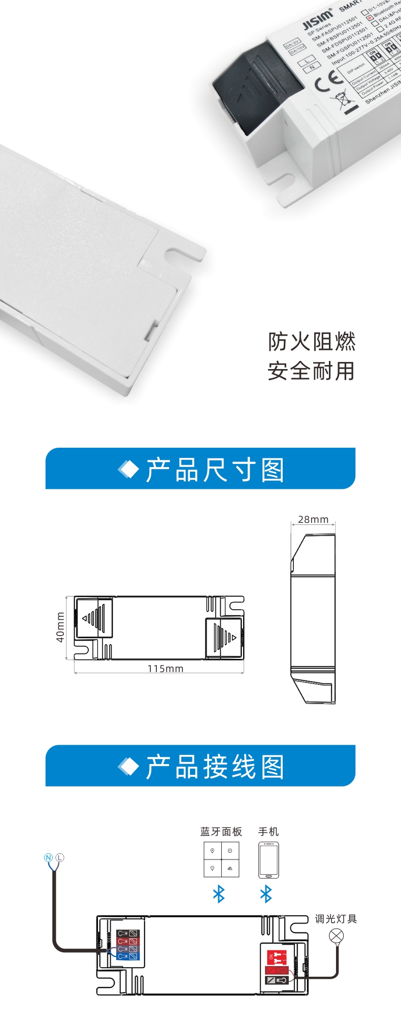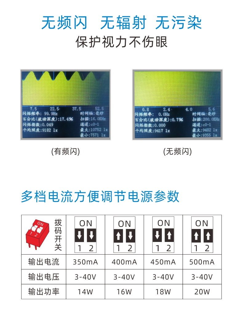 2.0-100%深度调光功能,支持多灯同步调光功能; 3.无频闪,符合IEEE1789,达到高频豁免级别; 4.通过拨码开关设置4档输出电流; 5.过载、过流、过温、开路保护; 6.符合CCC&CE&CB认证; 7.适用于筒灯、射灯、面板灯等室内照明调光灯具; 8.全系列为无铅环保工艺;