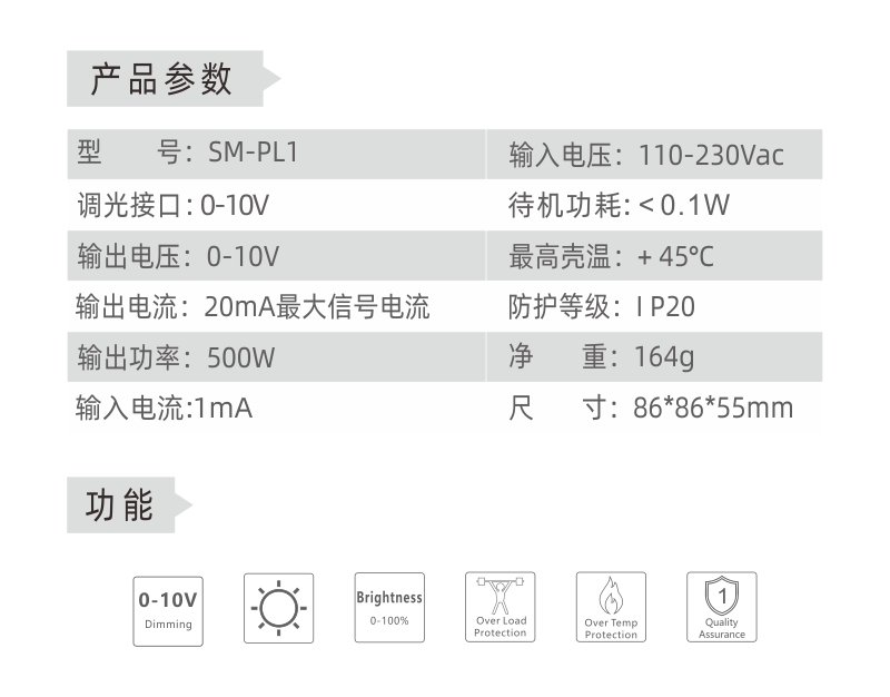 型 号:SM-PL1 输入电压:AC100-240V 频 率:50/60Hz 输出信号:0-10V 输出电流:20mA/路 工作温度:﹣20℃…60℃ 产品尺寸:86*86*51.5MM